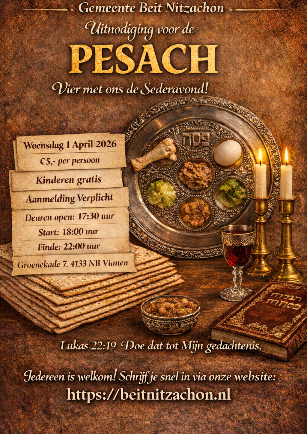 📅 Op woensdag 1 april 2026 nodigen wij je van harte uit voor een bijzondere en feestelijke Messiaanse Sederavond. Samen staan we stil bij de uittocht uit Egypte, vieren we vrijheid en ontdekken we de diepere betekenis van Pesach in het licht van Yeshua, de Messias.